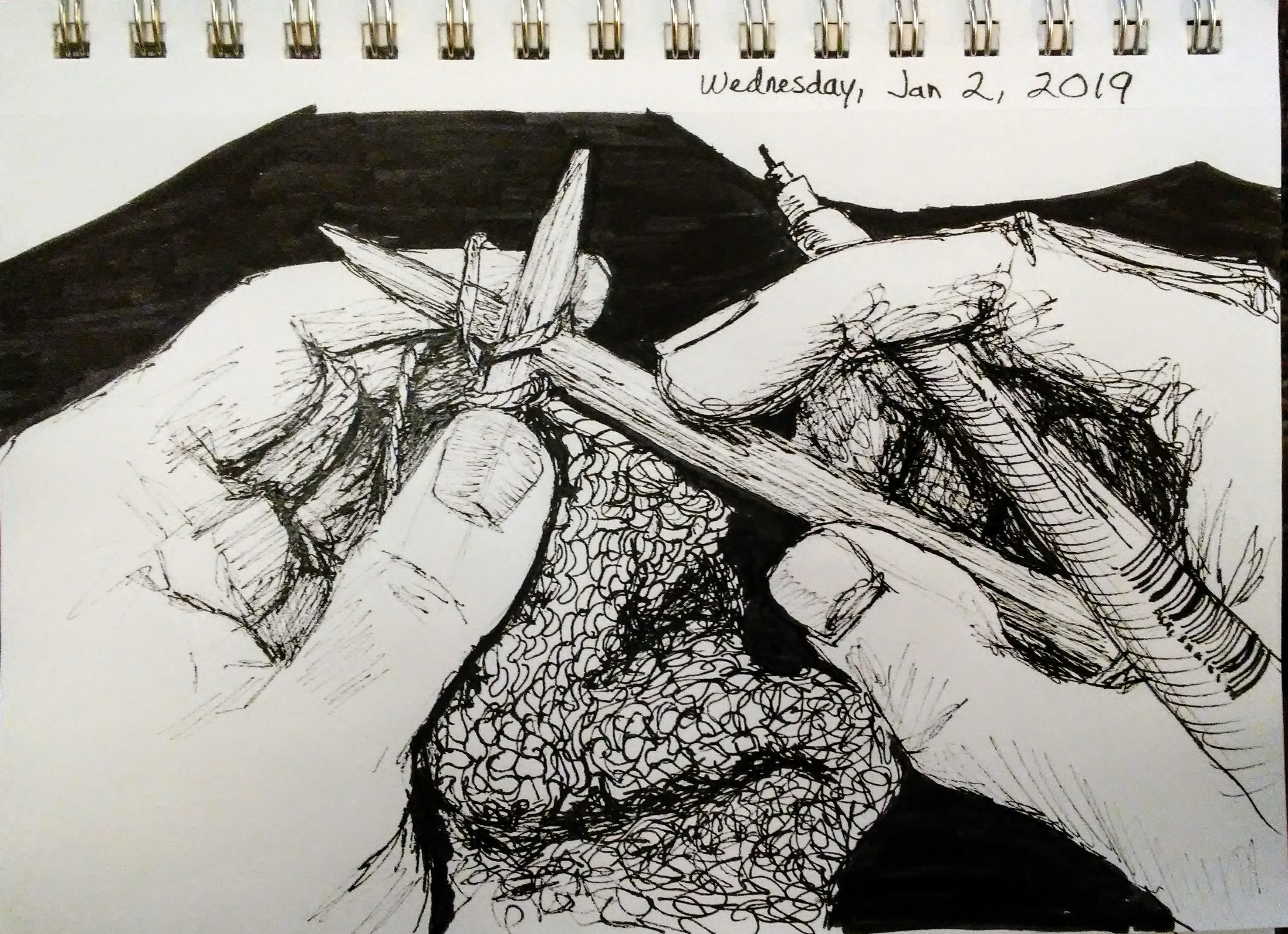 As I continue my effort to maintain a habit of creativity, I find myself drawing indoor things. Drawing more often, but mostly on sketchbook pages. I am walking more often, almost daily, but shorter distances. Is my art about indoor things because I am glad to be back inside where it is warm? Is my art still a response to my exploration of nature? My inner critic is confused. Is this change good or bad? Walking and drawing more often is good. Almost never doing long hikes or big paintings is not so good. This is probably a necessary stage in establishing the habit. Regardless of what my day has in store, I can take a few minutes to do what I love.
