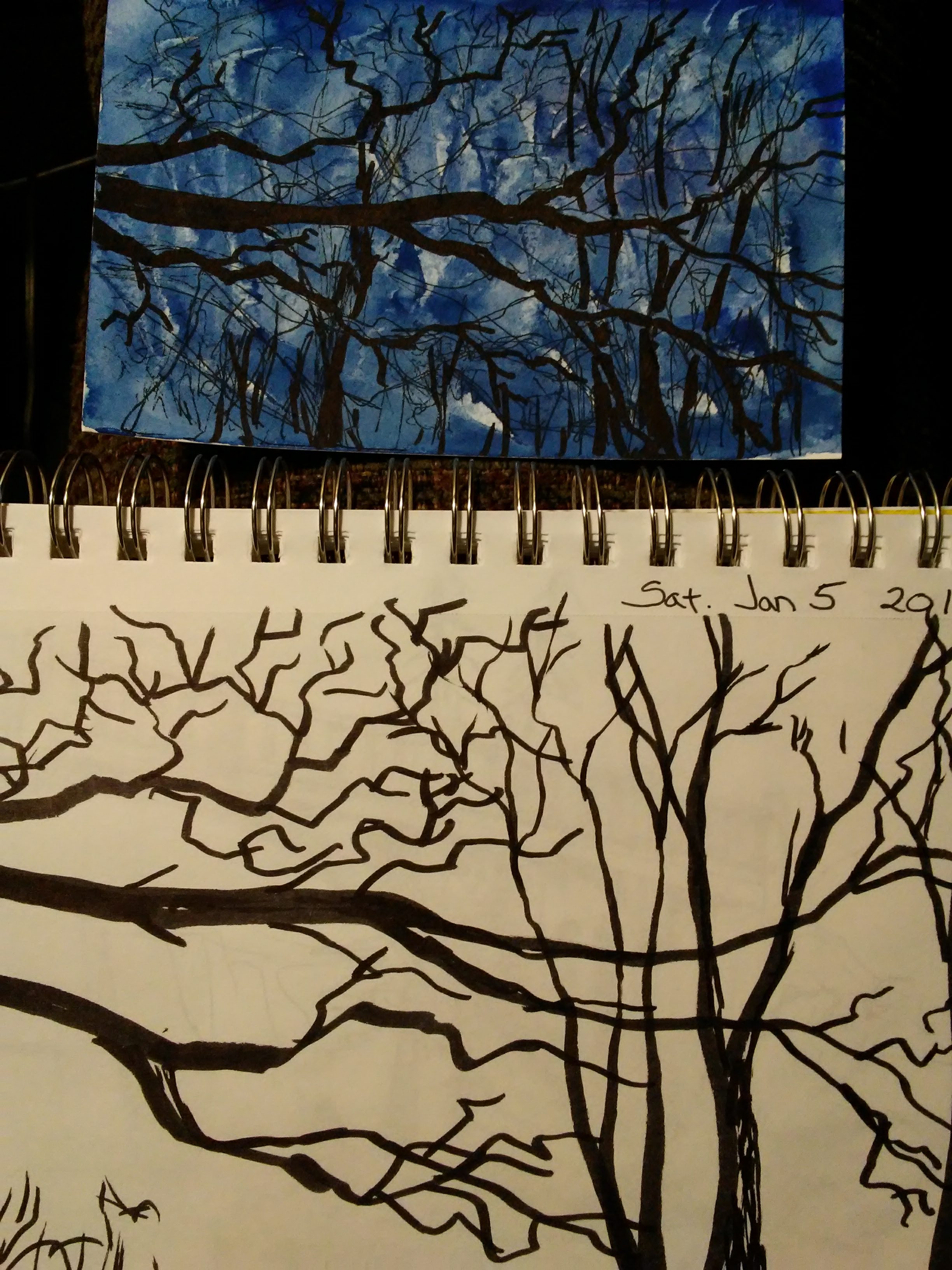 Lately my artistic interest has been the shape of oak leaves. Today I was struck by the shape of oak branches. They do not have graceful curves like other trees, their branches change direction abruptly. It is as if they keep changing their mind about which way to grow. I can relate to that. Indecision is a constant companion for me.