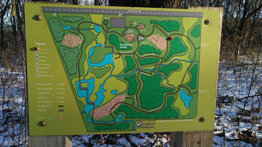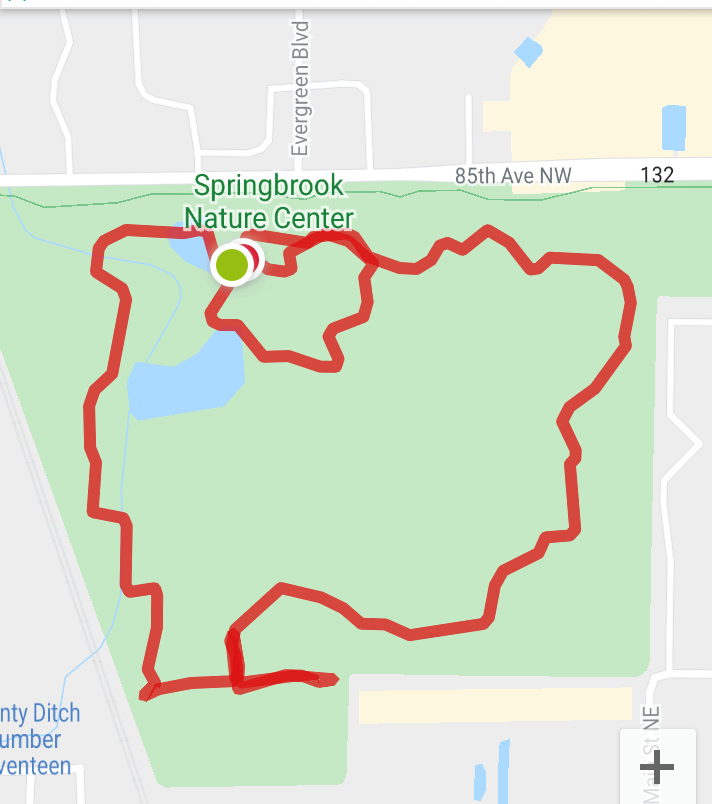 This park has been the place I go to recharge when I have time between appointments in the northern suburbs of Minneapolis. Walking all the trails adds up to about 3 miles (5 km). Because I like puzzles, I like to try to cover every trail without going on any part twice. If that is impossible, I try to at least go in the opposite direction to get a new perspective. As you can see from the comparison of the two maps, on that day I missed a lot of the trails. It was time for the next obligation of my day. At the south end of the park there is an old trail that is no longer maintained. I followed it a short way before I realized it was a dead end. It was pleasant to walk a little further along the stream. Let me know in the comments if you think it is possible to walk every trail just once and cover them all.