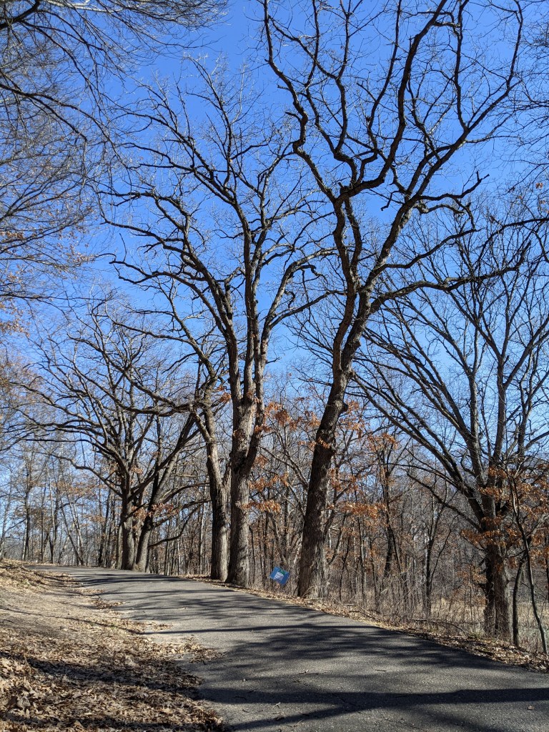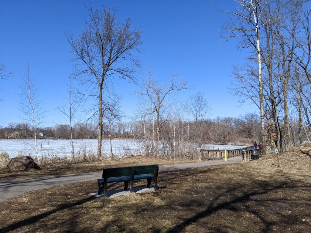 This is 200 acres of forest, lake, and marsh that has many paths, both paved and earth-surfaced. A beautiful “Discovery Center” has modern restrooms, an art gallery, outdoor classroom spaces, covered picnic area, free parking, and a historical restoration of a 19th century schoolhouse. Other Oakdale parks are nearby. I am sure it would be possible to create a longer suburban hiking route that would have minimal road-walking. On Friday I enjoyed just wandering the loop trails, talking with my friend, and soaking up the spring sunshine.