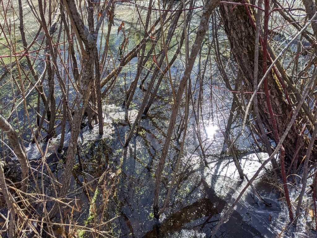 The red branches, green duckweed, and white ice was quite striking in real life.