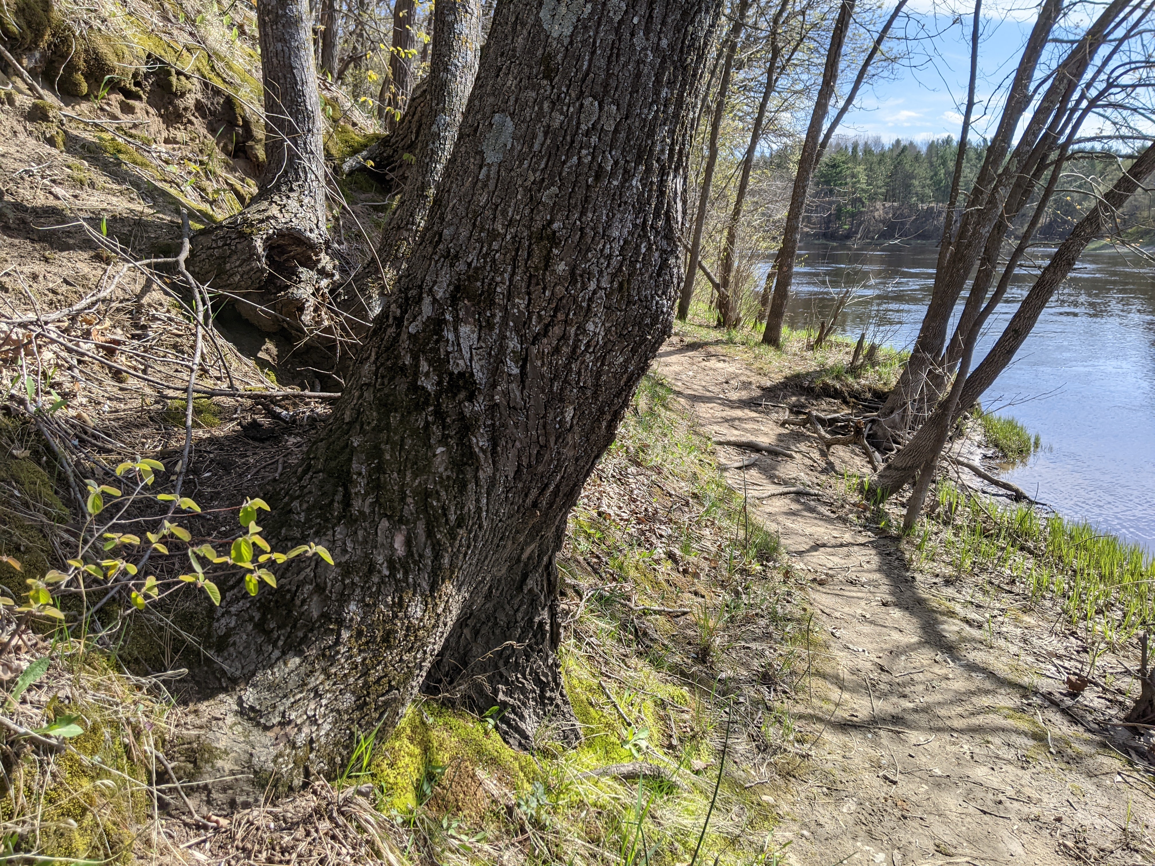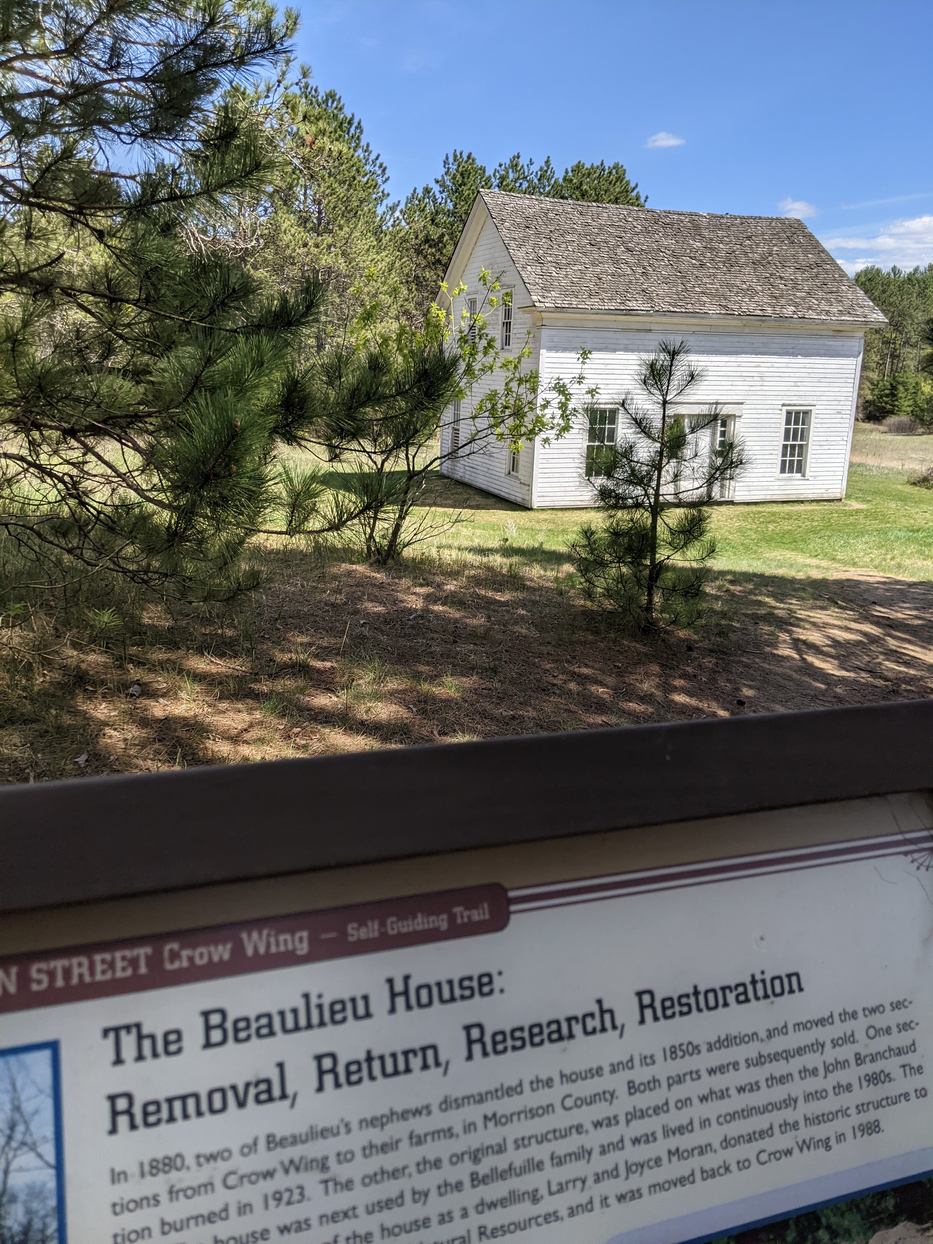 Starting the hike, I had the choice of following the river upstream or downstream, or entering the forest. I chose the forest. Walking on a carpet of leaves as the sun made a mosaic of bright spots and shadows, I was really enjoying myself. On Mother’s Day, I followed the trail upstream and saw historic buildings and informational signs about the city of Crow Wing that used to be the center of commerce in this area but no longer exists.