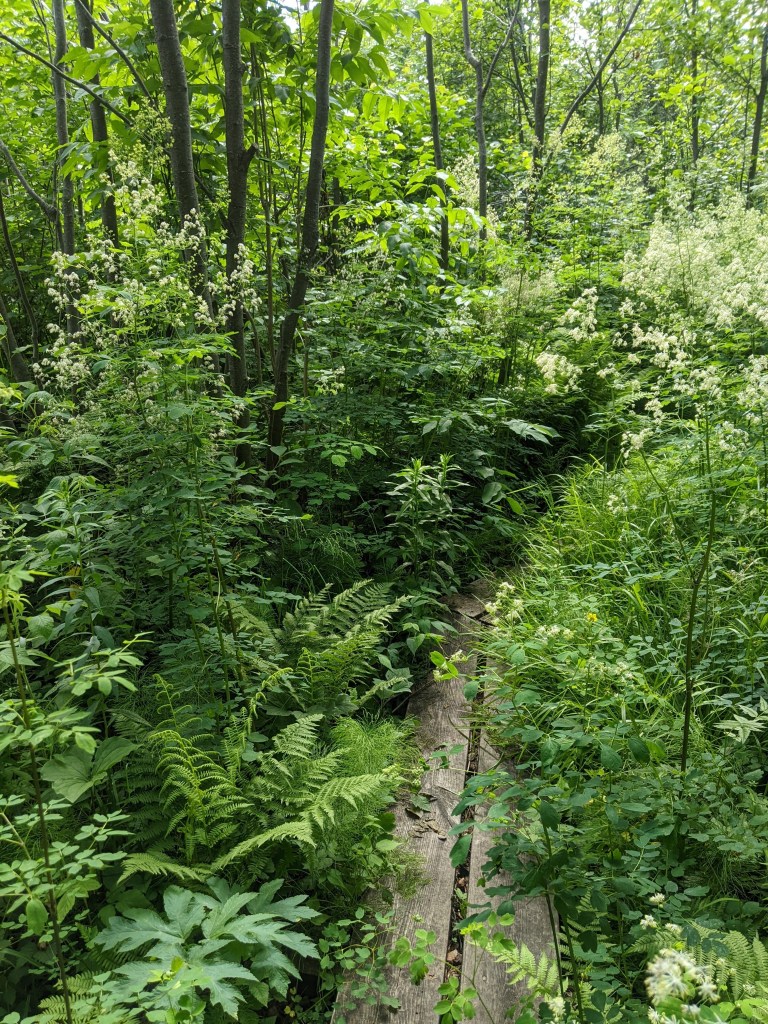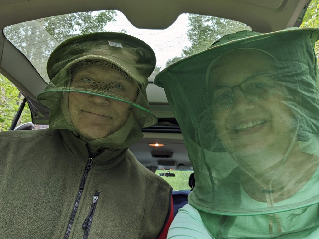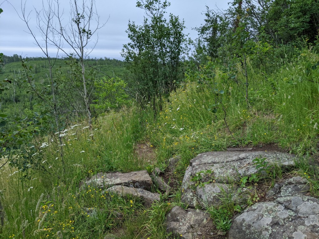 The Jackson Lake Road Trailhead is miles off Highway 61 near the town of Hovland, Minnesota. We kept thinking, “Did we miss it?” Finally we found it, just a small pullout, no bathrooms or pit toilets. It was big enough for three vehicles. The first thing we noticed when we got out of the car was the mosquitoes! We were thankful for our bug hats. There were also lots of berry bushes, but it was too early for berries. We were there in mid-July, 2022.
