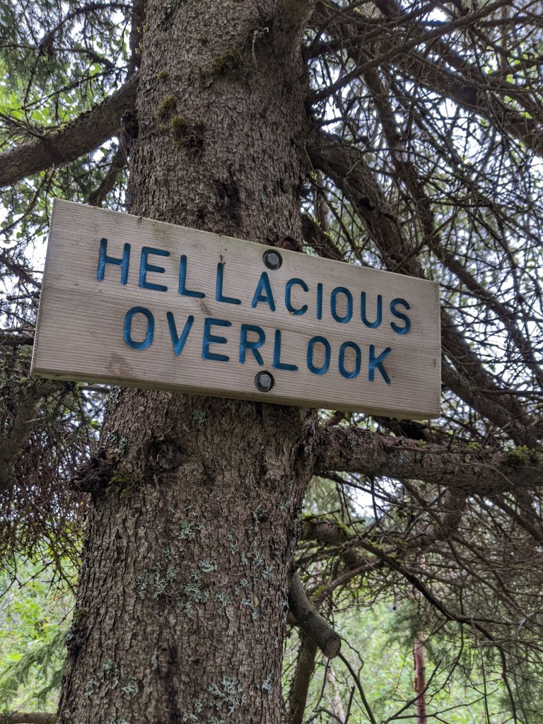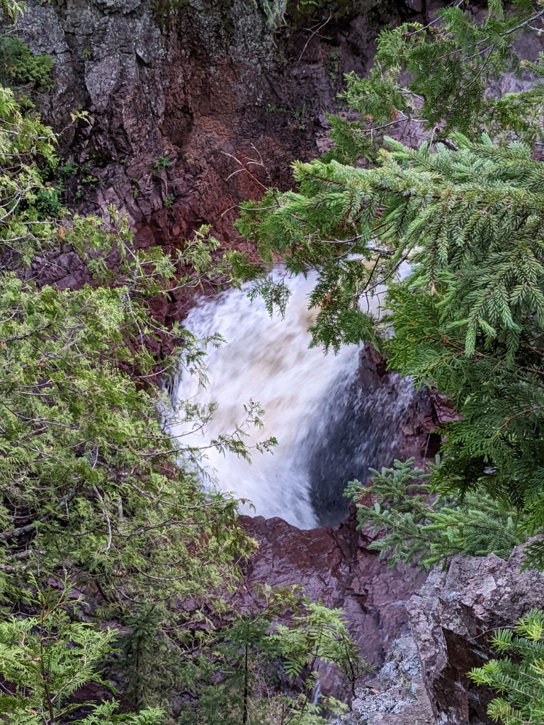 By the time we reached the rock formation called “Devil’s Kettle” it was getting dark and we were TIRED. I’d like to return there when I can more fully appreciate the unusual way the water disappears into the rock. We had a campsite reserved at the State Park campground and thought it was close to Devil’s Kettle. We were wrong. We were also unaware of the damage to the trail from the floods earlier in the season. I thought I had checked the website, but I missed that bit of information. There were places where the trail was completely washed away. We just followed the river downstream and were not worried about being lost, but it was a bit rough in spots. Just before Devil’s Kettle, we found ourselves on the wrong side of “trail closed” sign. I wonder if there was a sign on the other end that we missed? Soon after we came to THE STEPS. We did not count them. I’d estimate about 200. They were very nice wooden steps with railings and benches, but it was getting darker and we were finding it harder and harder to stay positive!