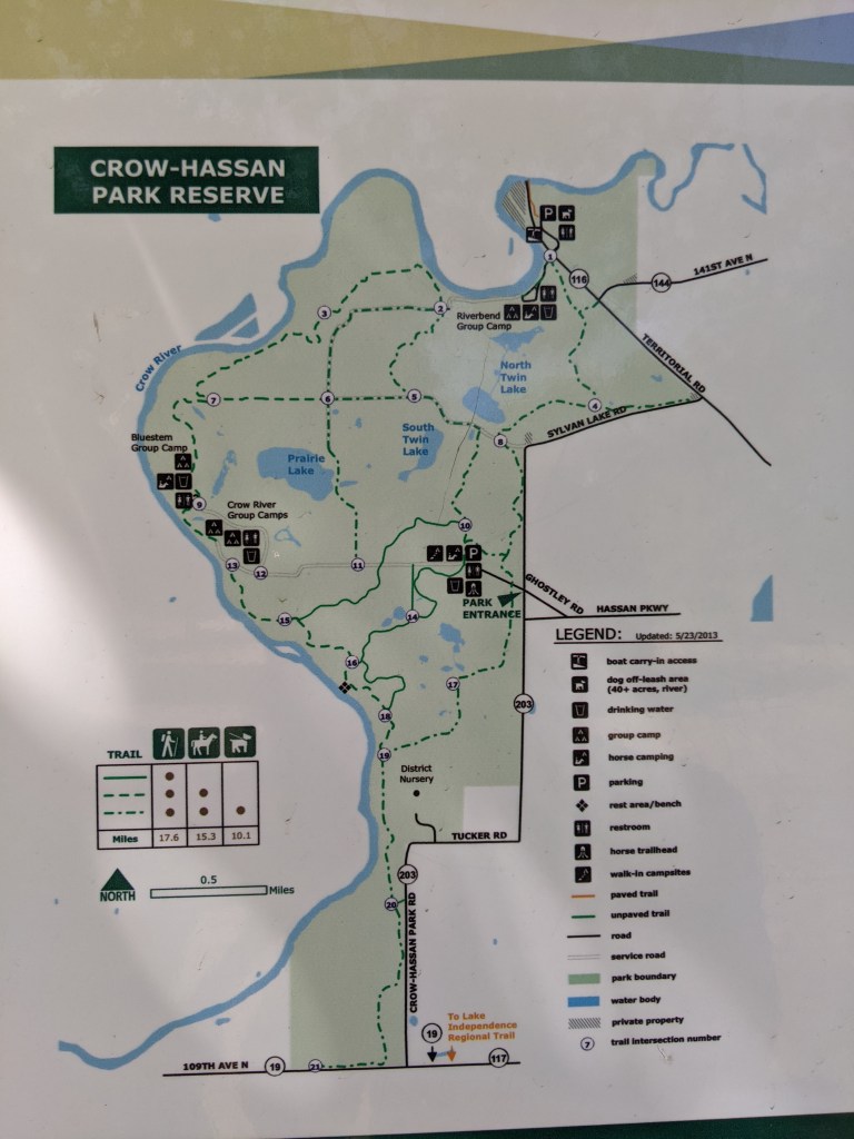 I walked here with a friend in June of 2021 and again on April 29, 2023. At the time of this post update (April 30, 2023), the Crow River is running very high. Parts of trails are flooded. If you are planning to hike here, I hope you find these maps helpful: