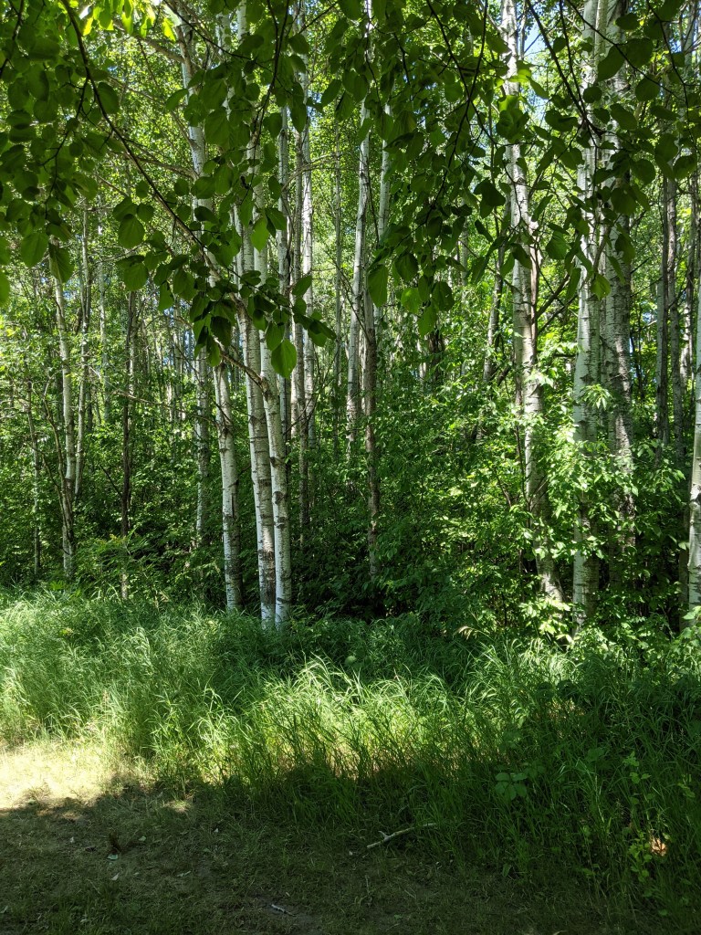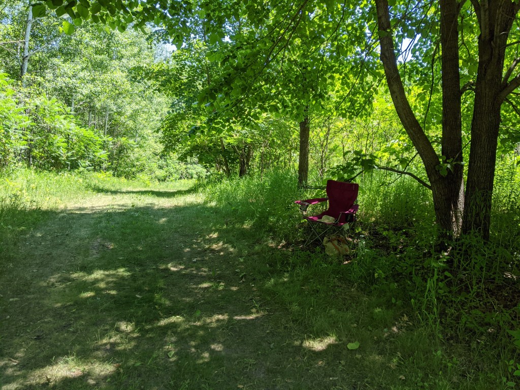 After lunch in the shady picnic area next to the restrooms and parking lot, my friend needed to carry on with her day and I returned to the trail with a chair to find a shady place to sit and draw. I found one less than a half-mile from the parking lot and drew some birch trees. It was lovely to sit and just notice. Only one trail user and her dog came by my resting spot. It was a pleasant interaction and I was able to meet a dog which I always enjoy.