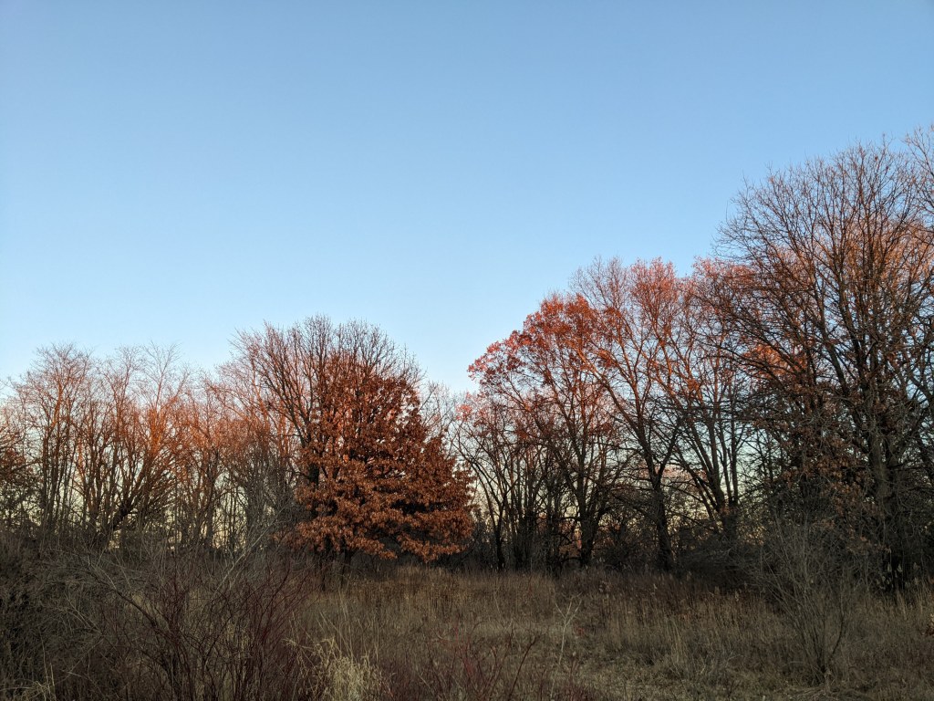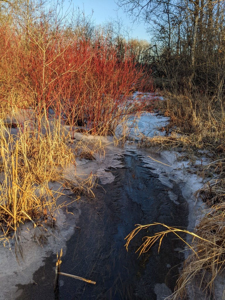 The trails are natural and not maintained in winter which means that if you are the first to enter after a snowfall, it is up to you to blaze the trail. I love that. In February 2020, I entered where the map said there was an entrance. I felt like I might be doing something against the rules, tromping through snow up to the tops of my boots. I trusted my sense of direction, found a deer trail, and followed it until I found a bridge and the tracks of other humans. The rest of the time I was on trails covered with hard packed snow and the walking was easier. The other two entrances to this nature preserve had more defined tracks. I was never more than 300 meters from houses, businesses, and busy roads, but it felt like being far from the city. I saw evidence of a large carnivore, possibly a wolf or a coyote? It was feces with big chunks of fur. This is not unheard of in Minnesota, but unusual in a large city. There is lovely variety of scenery here: forest, wetland, open grassland, hills. I had a rare unscheduled day with mild weather so I stayed a long time. There were a couple other people walking dogs, but otherwise I had the place to myself. A practical note: There are no facilities here. Take care of water and bathroom needs before you arrive.