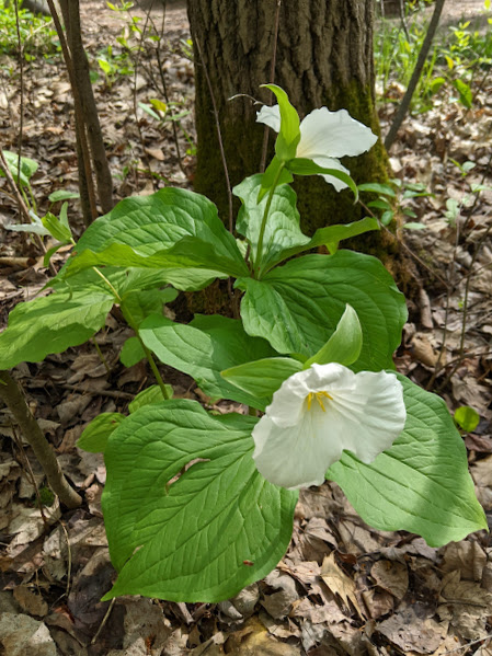 The other trails have names like Dead Man’s Trail, Hell’s Gate Trail, High Bluff Trail, Skunk Cabbage Trail, and Trillium Trail. There are in fact many trillium flowers. These photos were taken in May of 2022. I had a lucky break once when camping here. When I got up in the morning, I saw that a nearby tree was broken. There was no storm in the night, the tree must have already been that way when I got there. If it had fallen all the way, it would have landed on my tent. Always look up when placing your tent!