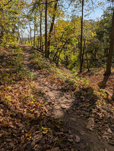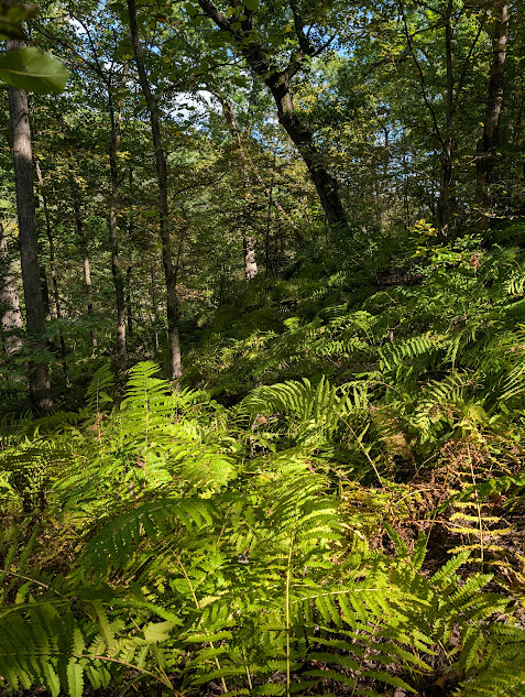 My mission on both visits was to hike the loop trail that is on the map posted at the entrance. I lost the trail both times and that is why I must return! I know that I could use technology and follow a dot on a phone screen but I wanted to be more connected to nature. The first time I tried a counter-clockwise loop. When you see a fork in the trail with a large painted rock, take the left fork. The trail followed the edge of another ravine and then entered a stand of mature trees with no undergrowth. It was like entering a large room. It was hard to find the trail again on the other side. The trail I found faded away after a short distance. I continued in the direction that seemed right. A marker I saw tied to a tree might have been a trail marker, or it might have been the property boundary. I only found one.