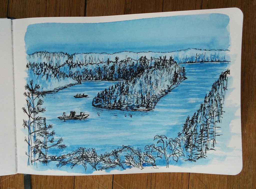 July 13 was the day my daughter fell while rock climbing. She passed away on July 17. I miss her terribly. The first week was hospital time. Nothing else. The second week I tried to draw but focus was not there. Doodling was soothing. There are tasks that need doing when a family member passes. The memorial service took all my energy. All of it. Last week in July was a cabin vacation with my siblings and mother. We are all introverts so it was very quiet there on that lake. It was exactly what I needed.