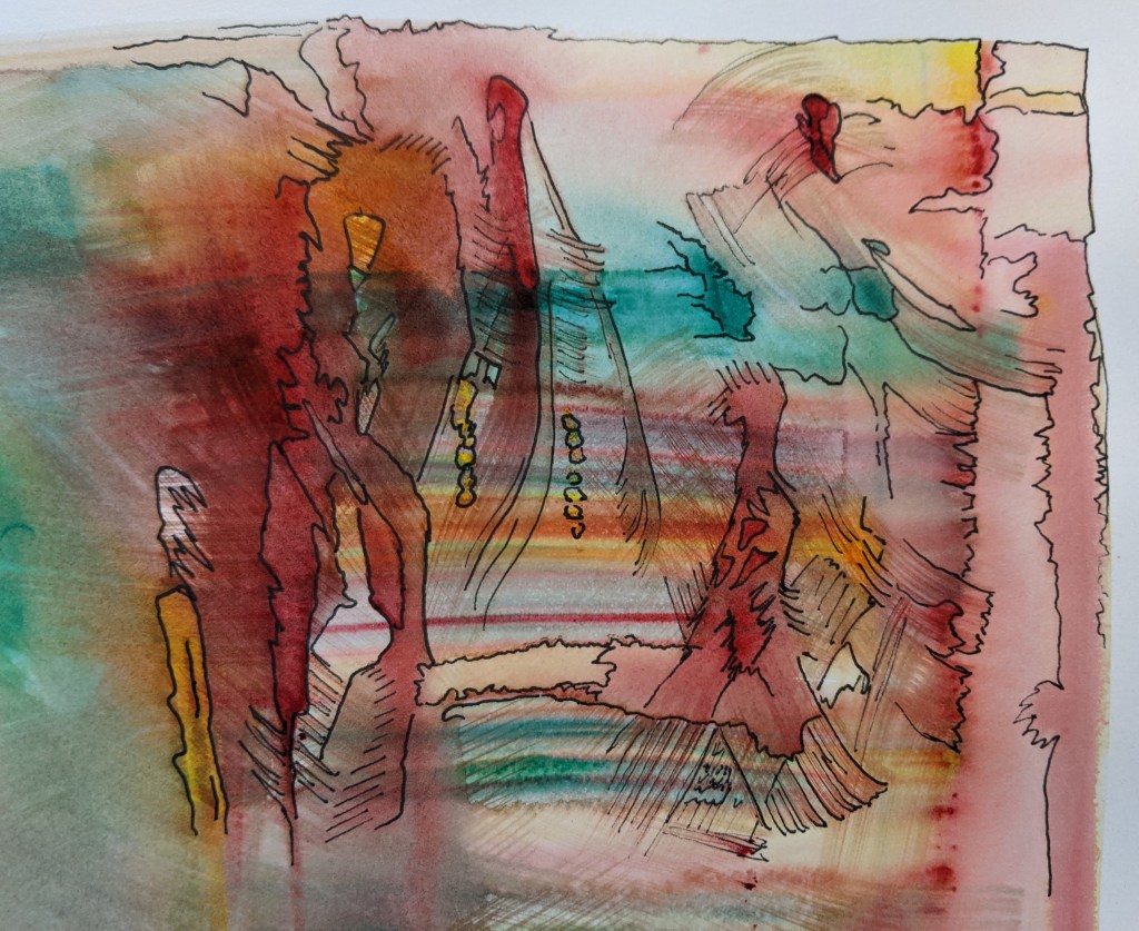 Mixed media is my jam lately. Acrylic over old watercolor paintings. Paint pen over old acrylic paintings. Collage. Scraping into layers of old work. That yellow abstract watercolor hanging on the wall over my table is not going to stay there much longer. “instinct says that what is one things will soon be another”.